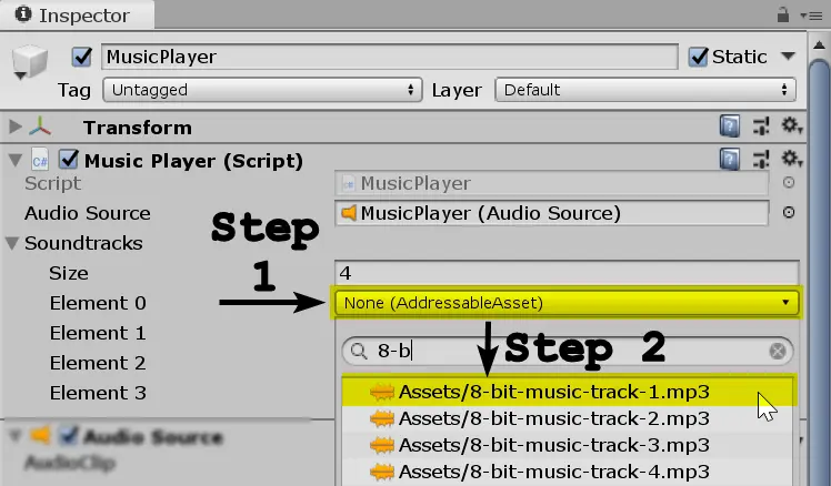 Coming back to our topic, you really don’t want to have too many direct references to different AudioClips at once. That would mean, they are all loaded in memory, even though we are potentially playing only one song.