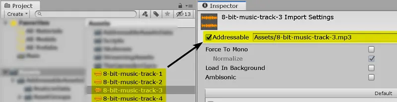 With each AudioClip selected, we then tick their Addressables checkbox in the inspector.