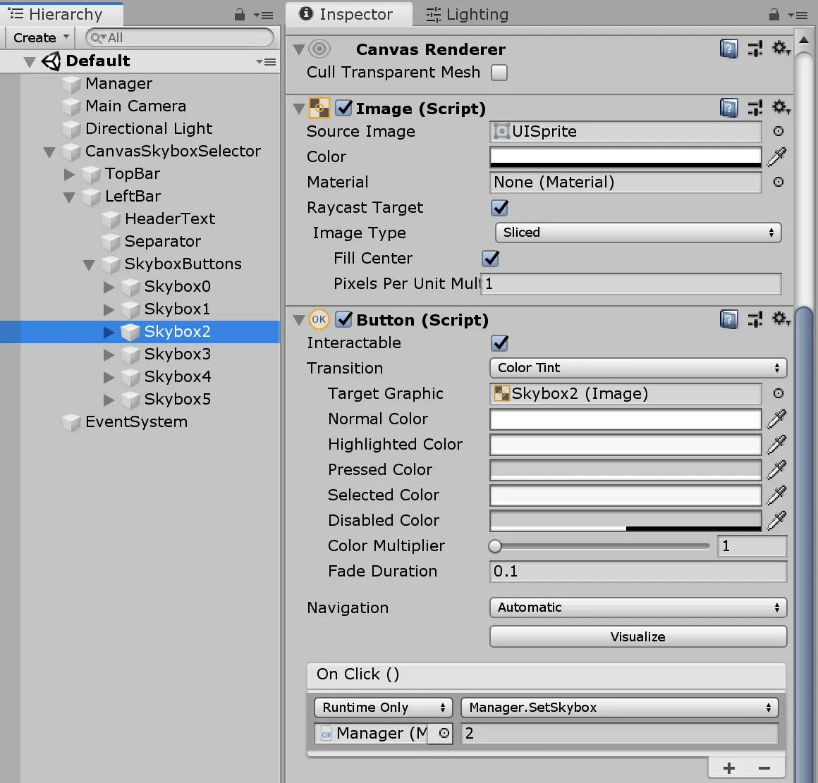 Secondly, we have our CanvasSkyboxSelector. This game object contains a canvas component, rendering a a collection of vertically-distributed buttons. Each button, when clicked, will invoke the aforementioned Manager function to swap the rendered skybox based on the button id. Put in another way, each button’s OnClick event calls the SetSkybox function on the Manager. Isn’t that simple?