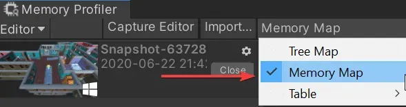 On the top side of the memory profiler, you can switch from the default Unity Tree Map visualization mode to Memory Map.