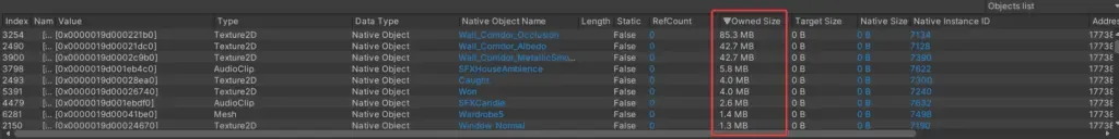 Finally, the objects list is arguably the most useful for us, Unity game developers.