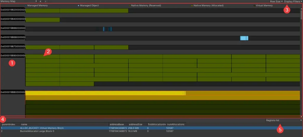 Here, we can switch between seeing the memory regions, seeing the allocations happening inside and the objects living there. - There's no 6.