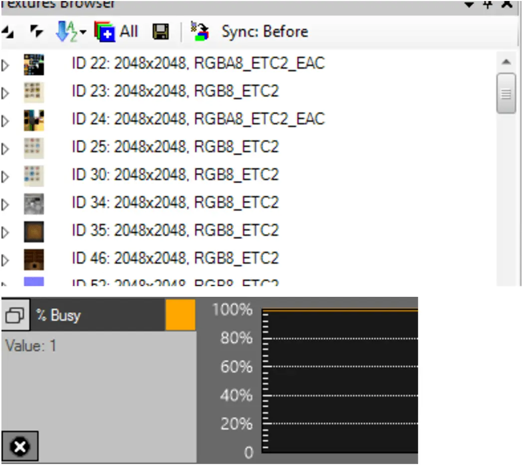 After starting Adreno/Snapdragon profiler I captured a frame to detect further issues and made a screenshot to convey the issues.. As it shows, textures aren’t doing especially well as there is a high number of relatively-big textures being uploaded in every frame, taking up a big portion of the RAM capacity as well as bandwidth requirements. That isn’t acceptable and will have to be corrected. What else did I find?