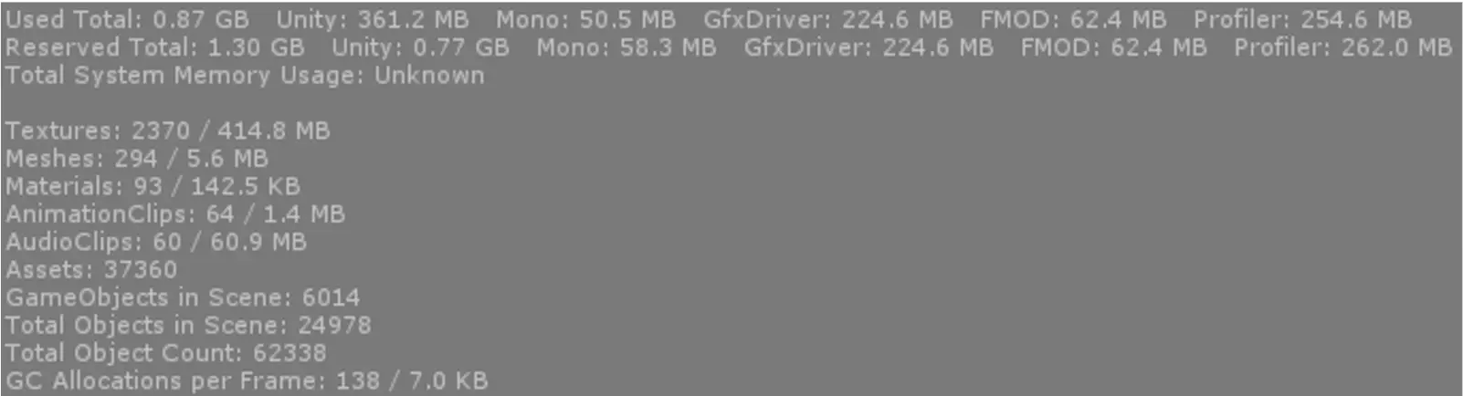Now we have something. 400mb in textures? That’s a lot. It is indeed a must to reduce texture sizes and set compression formats specifically for Android/iOS; that will be the first task I put in my todo list. Less texture data means less bandwidth waste and therefore shaders won’t stale too long while waiting for the sampled textures to arrive, meaning we achieve less power consumption or more performance.