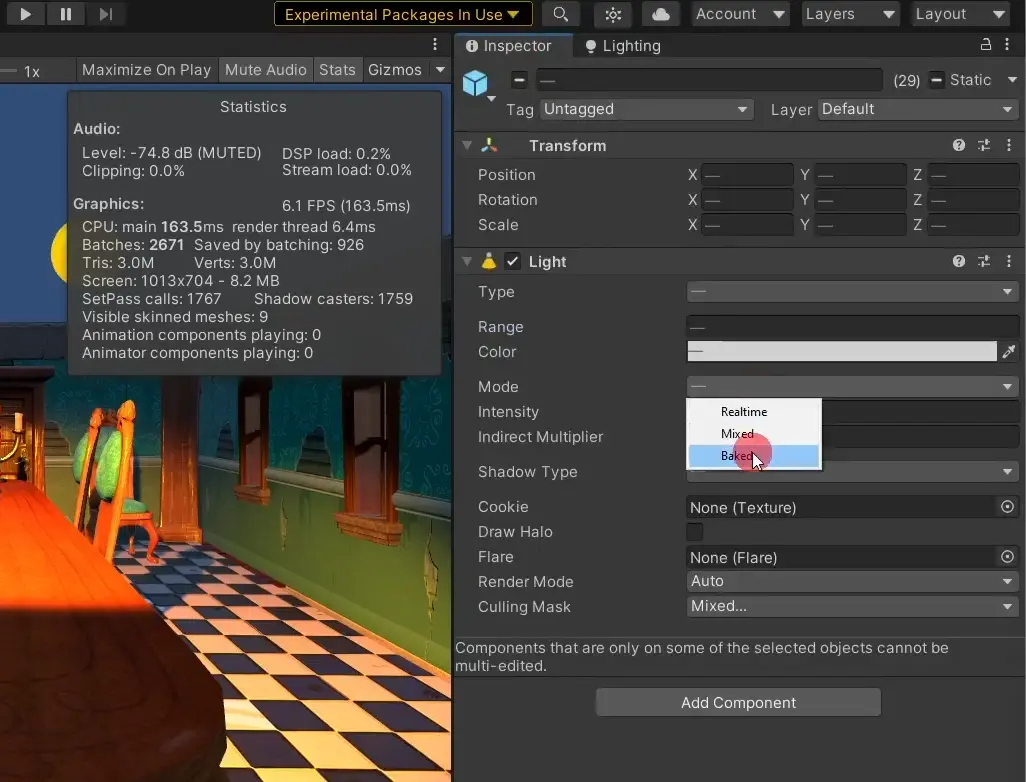 OK, so the second option would be to bake to these lights so we don't run these expensive calculations in real-time that are killing draw call batching.