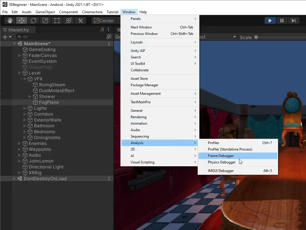 To analyze draw calls or batches we need to open the Frame Debugger.