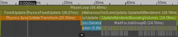 As you can see, Physics.SyncColliderTransform and UpdateRendererBoundingVolumes are taking a huge portion of your frame budget.