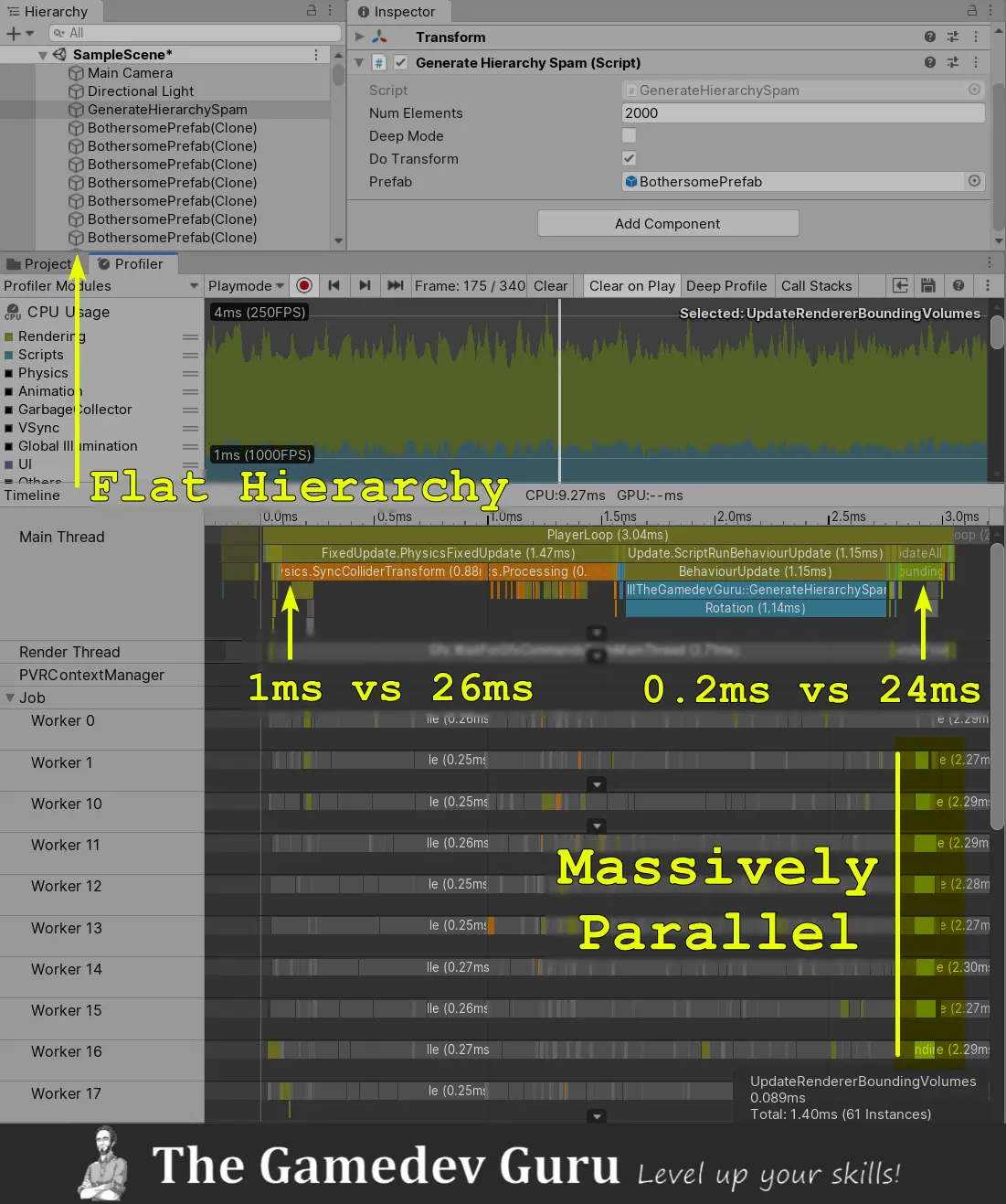 Let’s analyze the previously shown unity scene hierarchy. It contains 2,000 rotating spheres nested on top of each other.