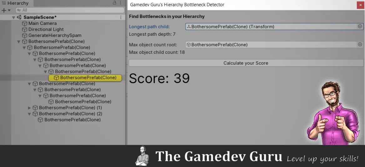 I prototyped a tool to automatically analyze and detect bottlenecks in your hierarchy based on The Gamedev Guru’s Golden Rules of a Clean Hierarchy.